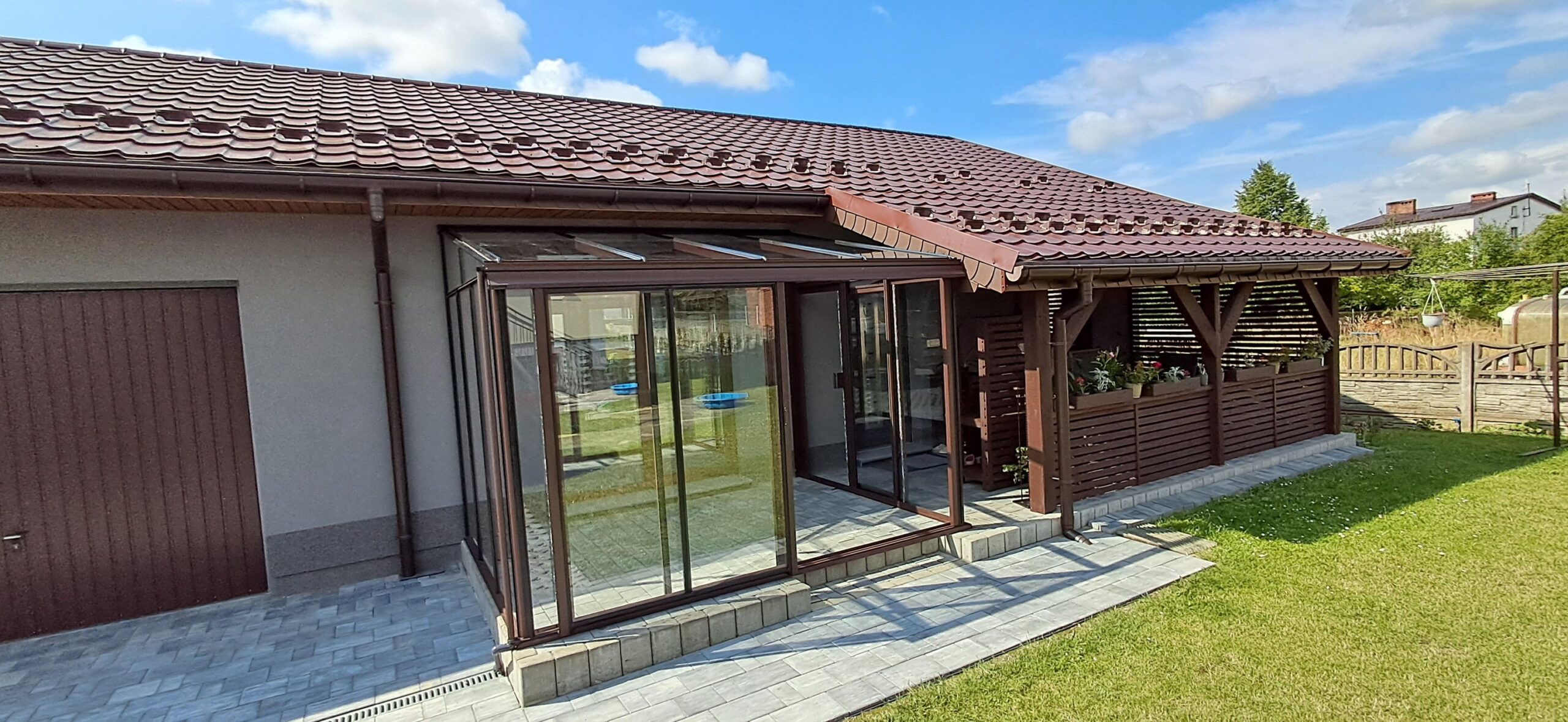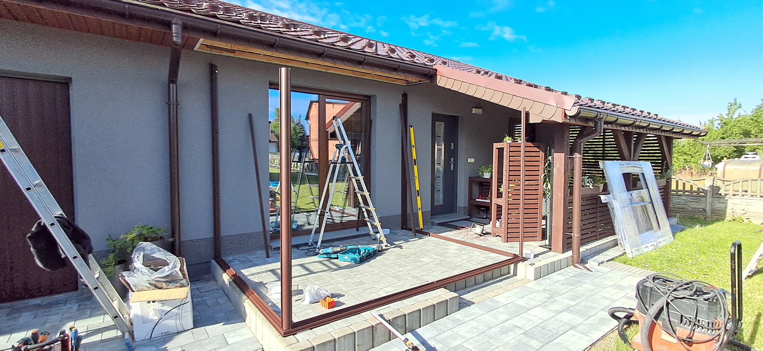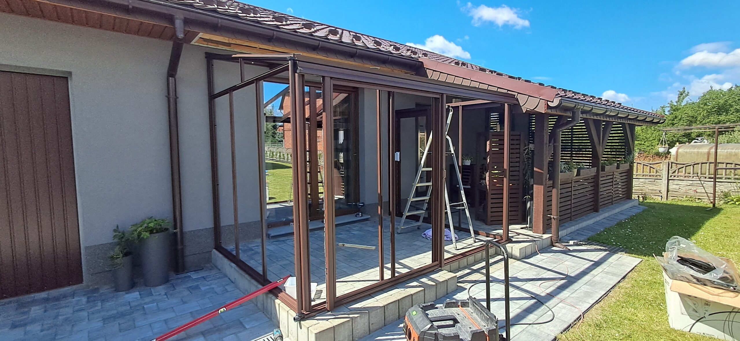 Montaż szklarni przyściennej Euro Veranda o wymiarach 233cm x 309cm. Aluminiowa konstrukcja w kolorze RAL 8017 – brązowy grizzly strukturalny została w całości pokryta szybą hartowaną 4mm. Na dłuższej ścianie zamontowano pojedyncze szerokie drzwi przesuwne o szerokości 144cm. Na krótszej ścianie pojedyncze drzwi przesuwne o szerokości 84cm. Wysokość ścian to 191cm, a wysokość kalenicy 242cm. Miejsce montażu – Sadów w województwie śląskim.