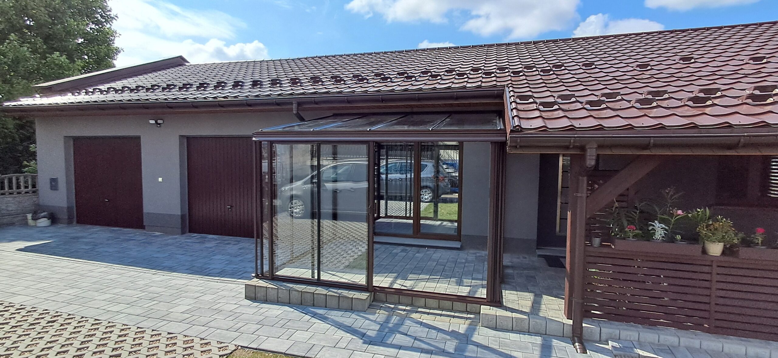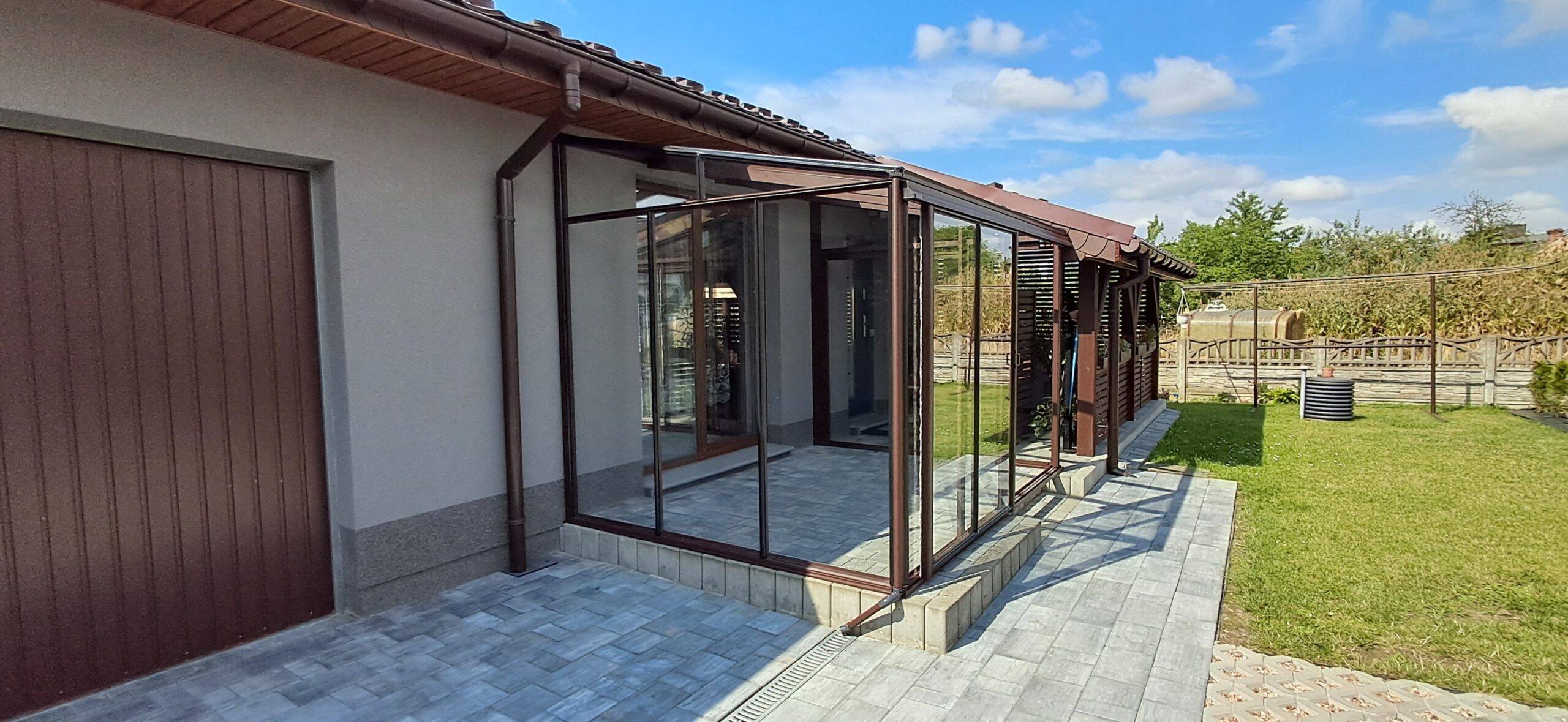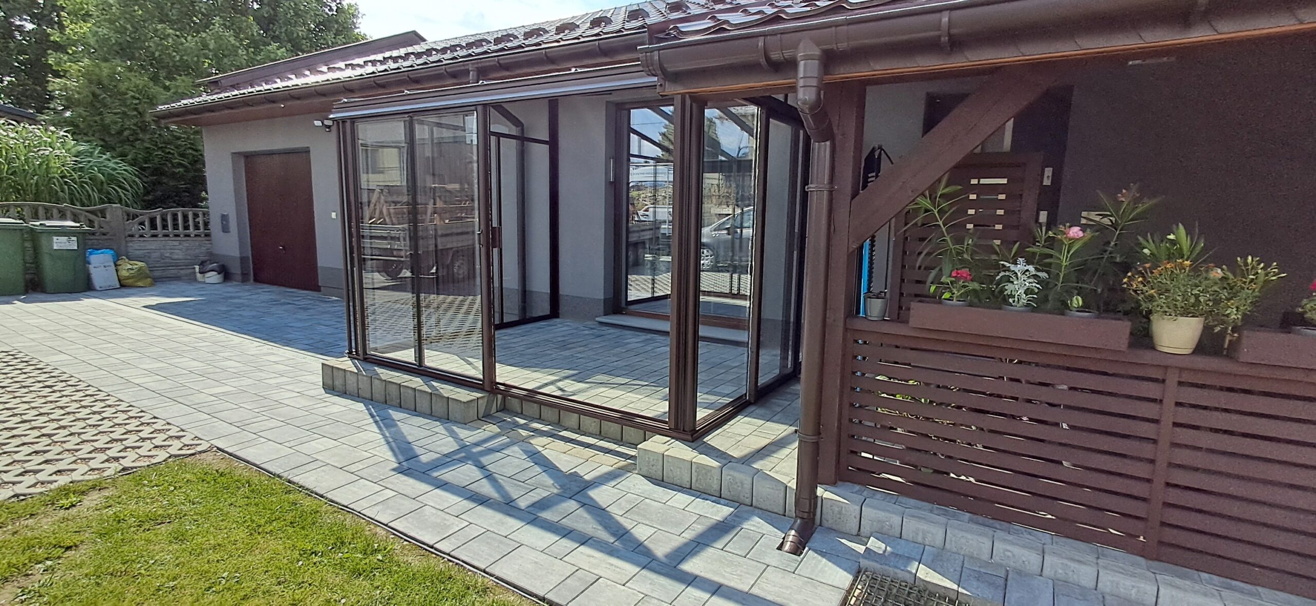 Montaż szklarni przyściennej Euro Veranda o wymiarach 233cm x 309cm. Aluminiowa konstrukcja w kolorze RAL 8017 – brązowy grizzly strukturalny została w całości pokryta szybą hartowaną 4mm. Na dłuższej ścianie zamontowano pojedyncze szerokie drzwi przesuwne o szerokości 144cm. Na krótszej ścianie pojedyncze drzwi przesuwne o szerokości 84cm. Wysokość ścian to 191cm, a wysokość kalenicy 242cm. Miejsce montażu – Sadów w województwie śląskim.