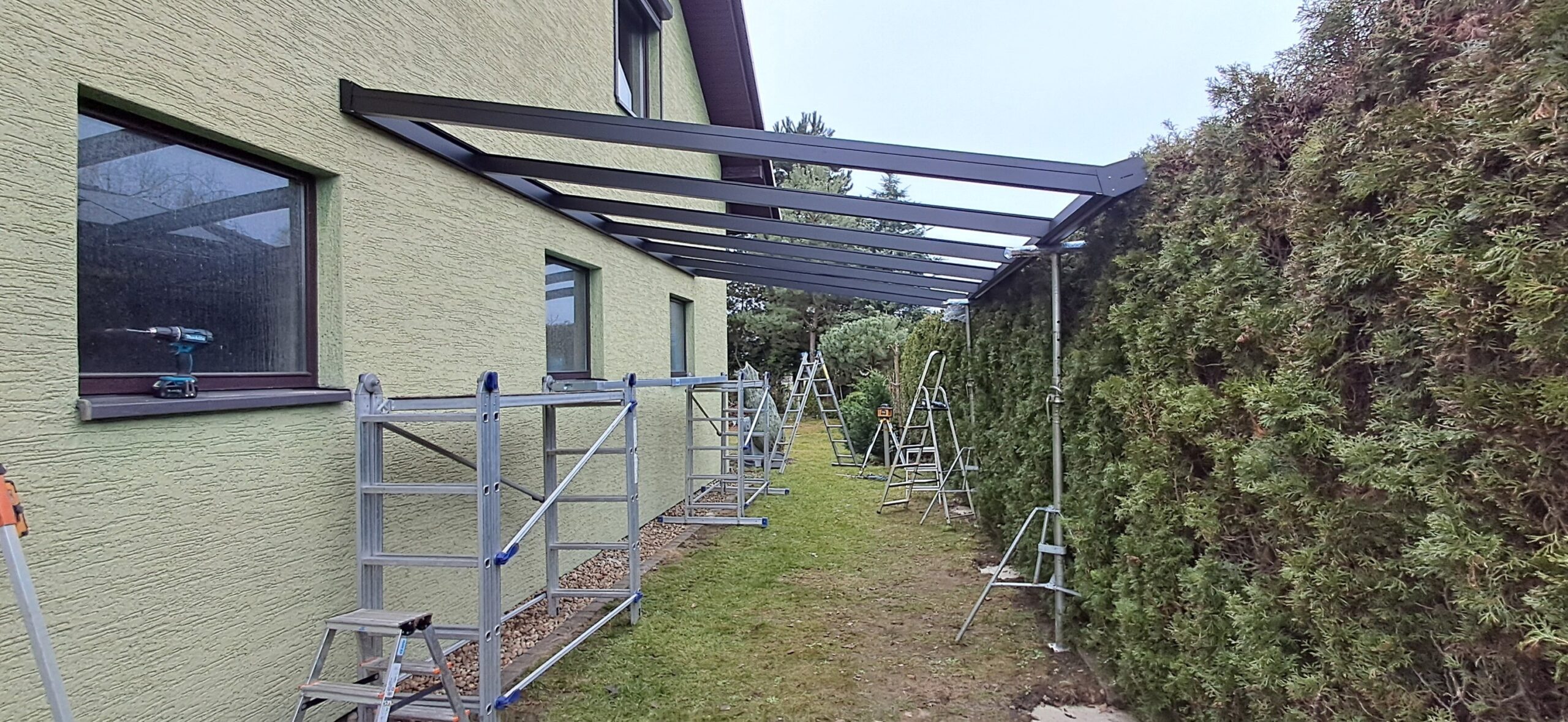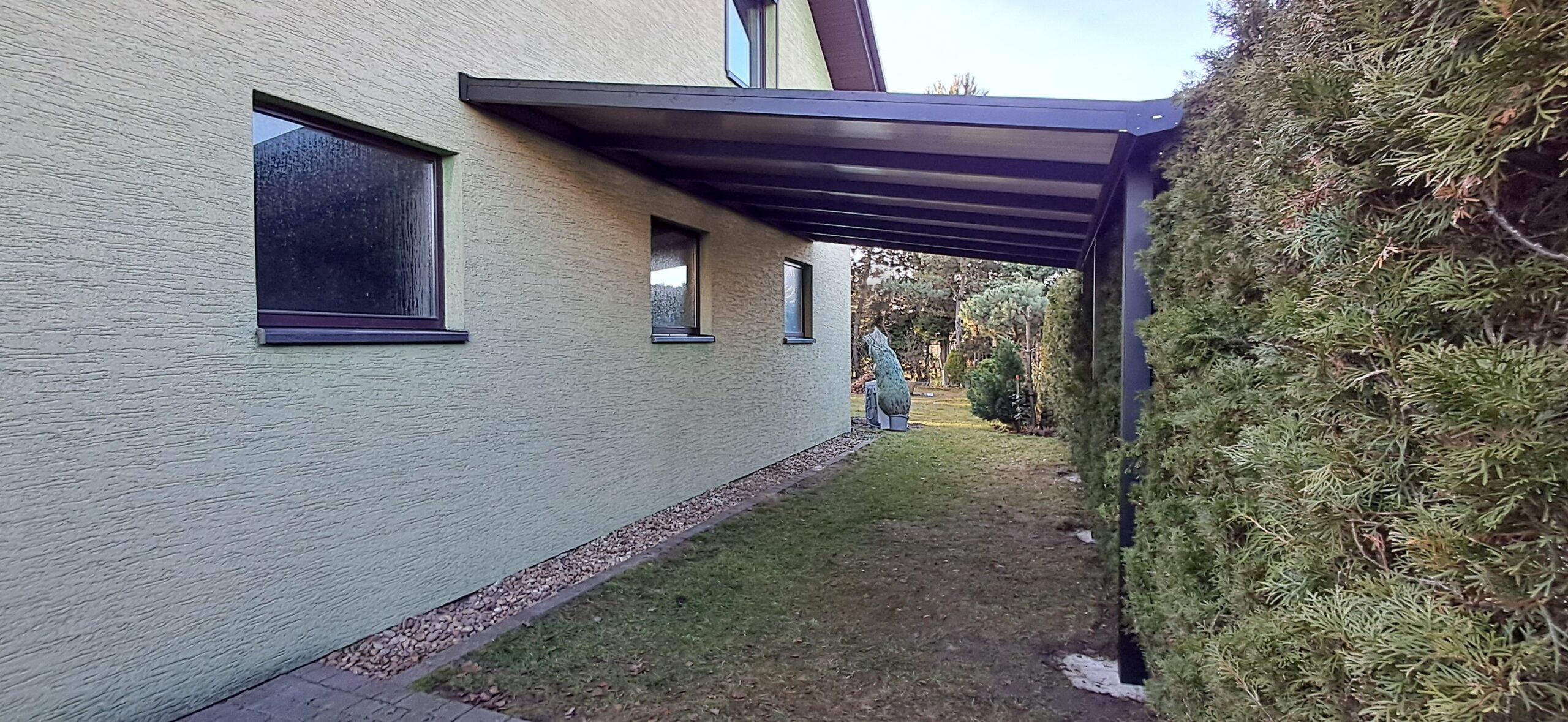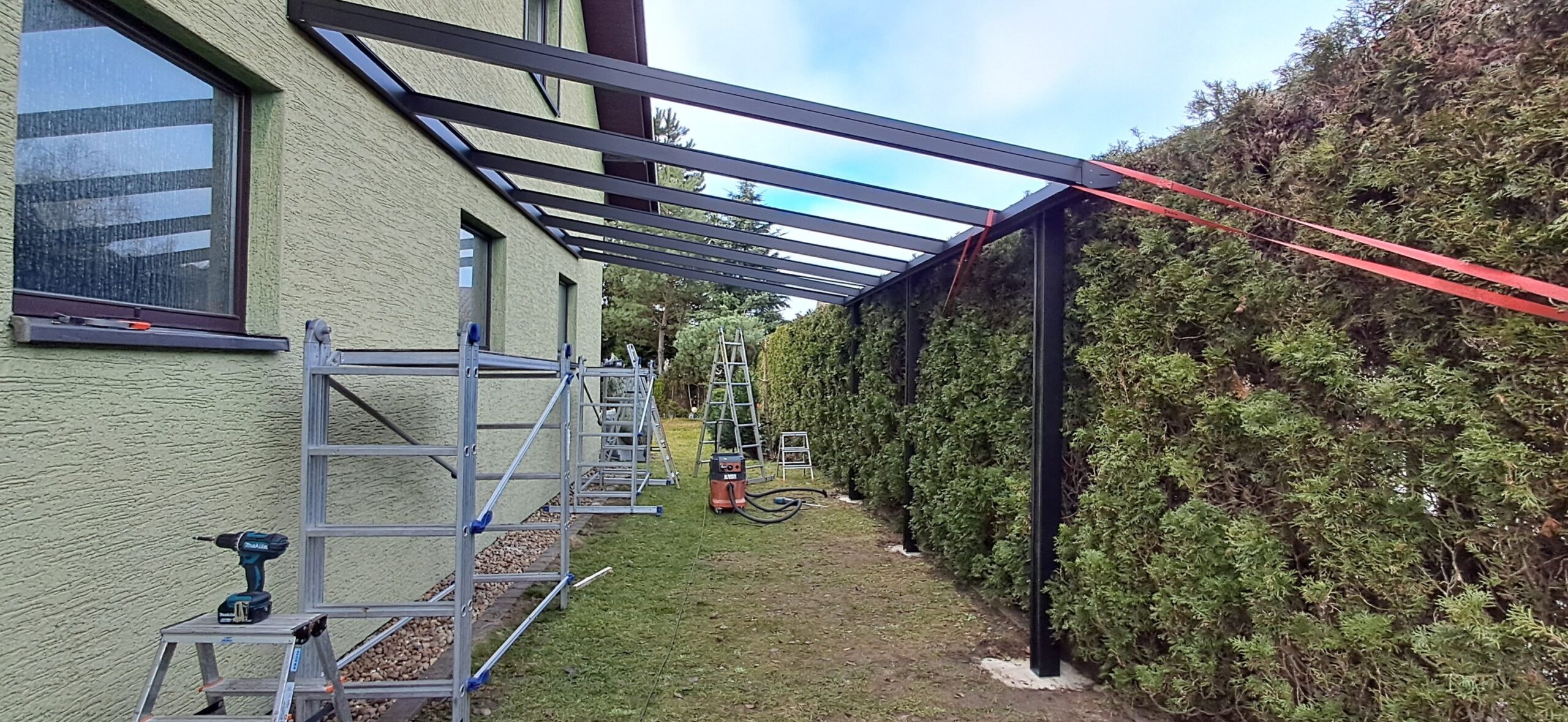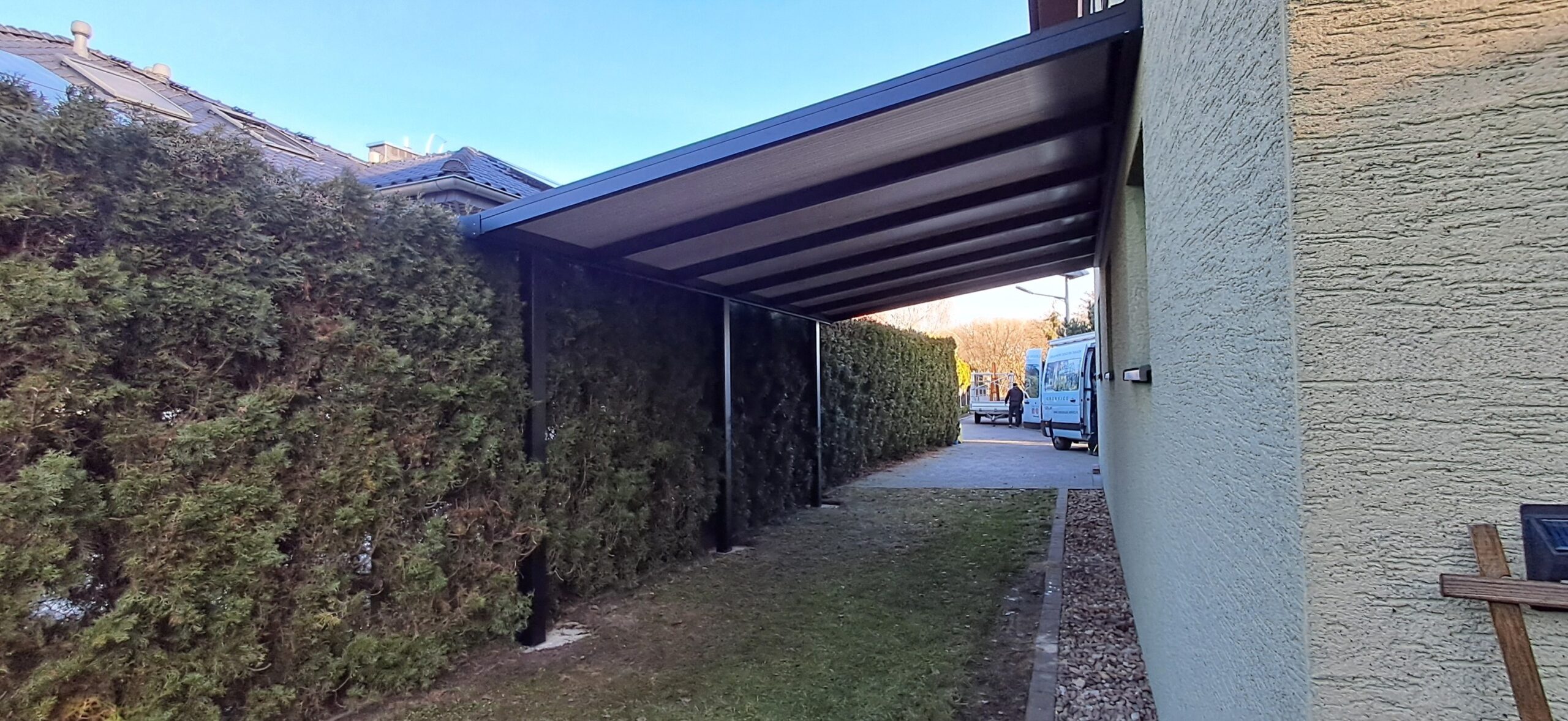 Montaż zadaszenia tarasu V905 o wymiarach 340cm x 600cm w charakterze carportu. Aluminiowa konstrukcja w kolorze VS905 – czarny strukturalny została pokryta poliwęglanem komorowym 16mm dymnym. Profil szczytowy zamontowano na wysokości 285cm, a profil rynny na wysokości 235cm. Zadaszenie podparte trzema słupami zamontowanymi do przygotowanych wcześniej stóp fundamentowych. Miejsce montażu – Lubliniec w województwie śląskim.