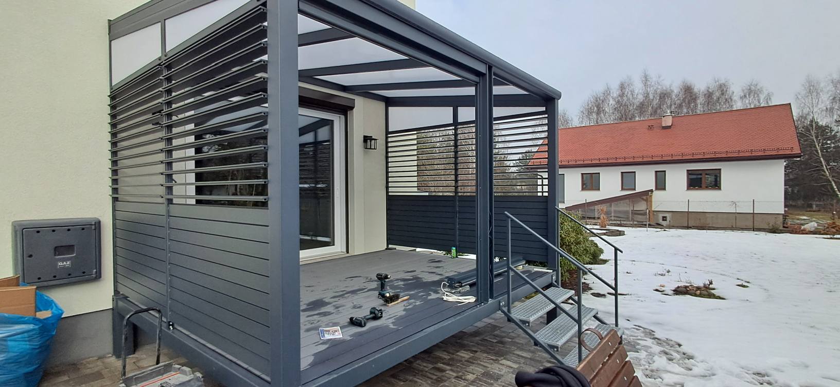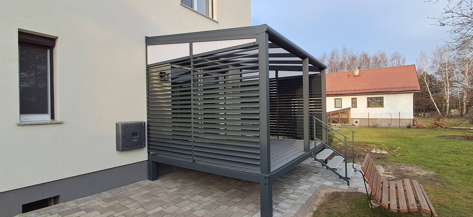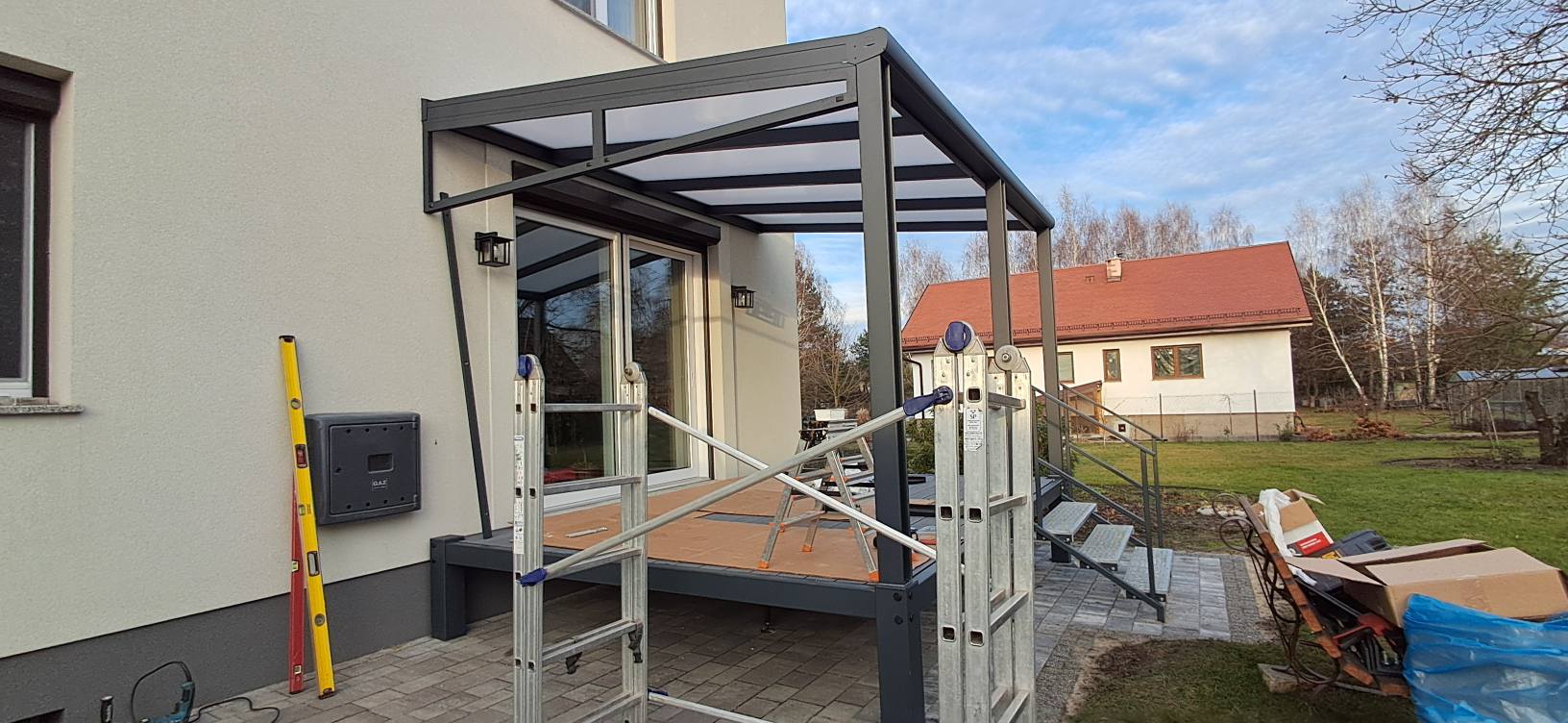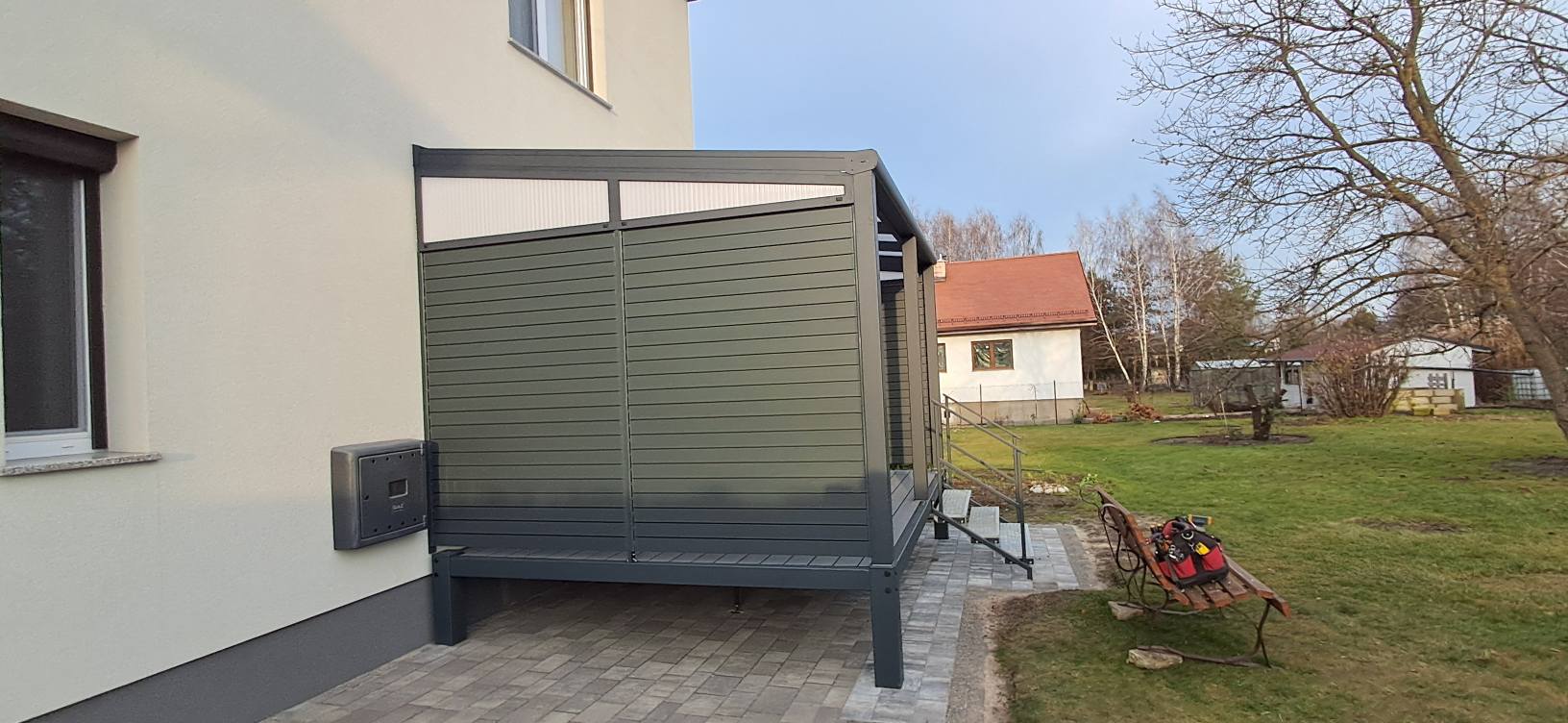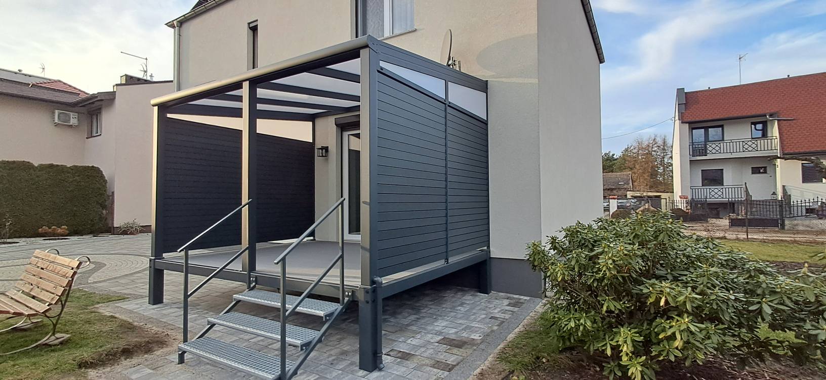 Montaż zadaszenia tarasu V905 o wymiarach 309cm x 397cm. Aluminiowa konstrukcja w kolorze VS716 – antracytowy strukturalny została pokryta poliwęglanem komorowym 16mm mlecznym. Po lewej i prawej stronie wykonana została zabudowa składająca się ze ściany szczytowej Serena wypełnionej poliwęglanem komorowym 16mm mlecznym oraz z ruchomych żaluzji aluminiowych w kolorze antracytowym. Zadaszenie podparte trzema słupami. Wysokość profilu szczytowego to 255cm, a wysokość profilu rynny to 220cm. Miejsce montażu – Lubliniec w województwie śląskim.