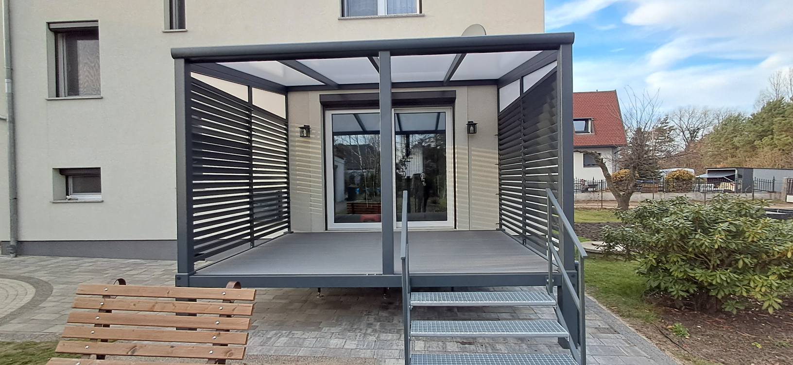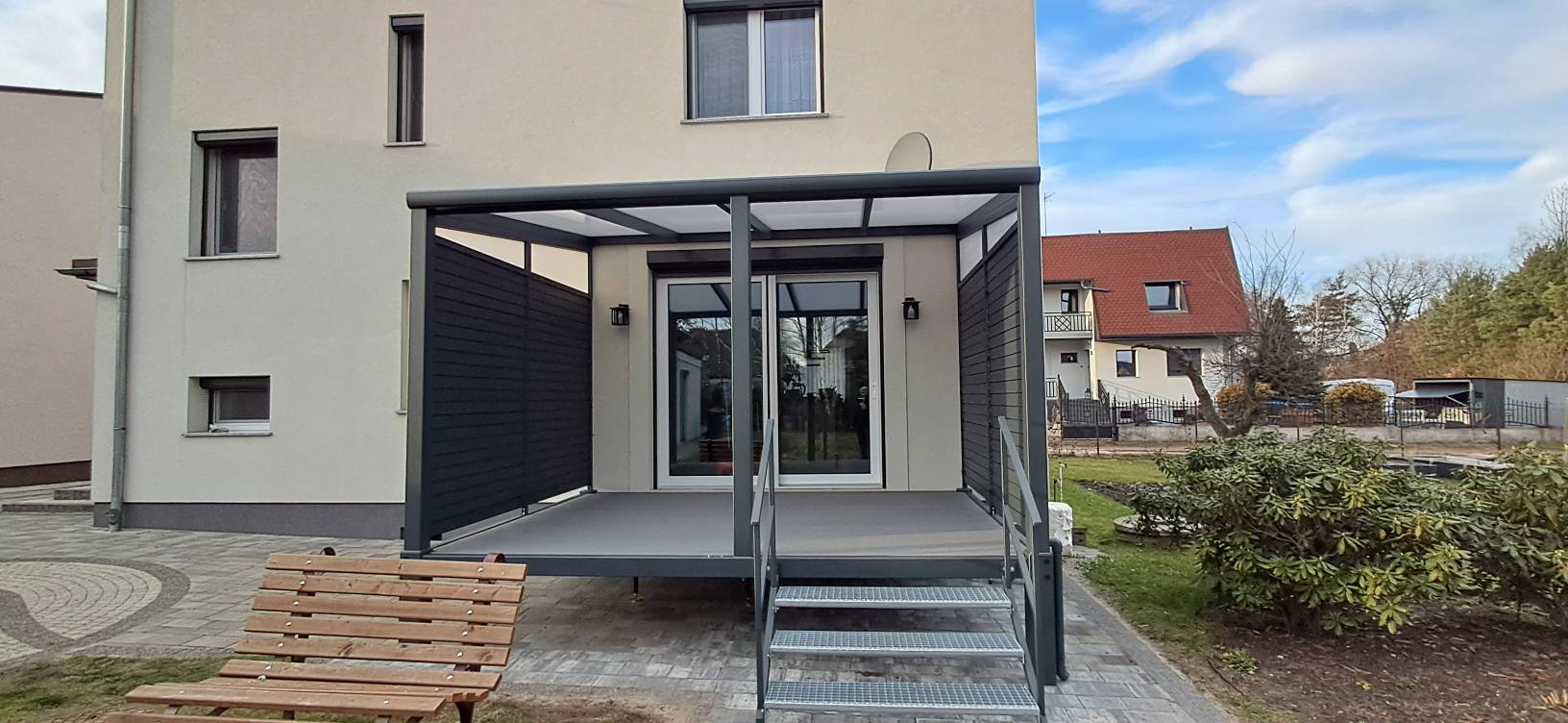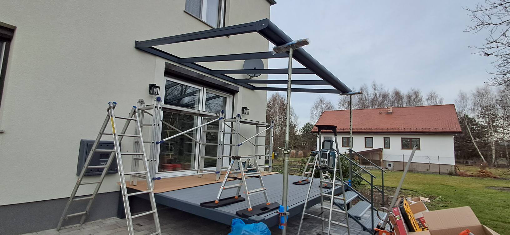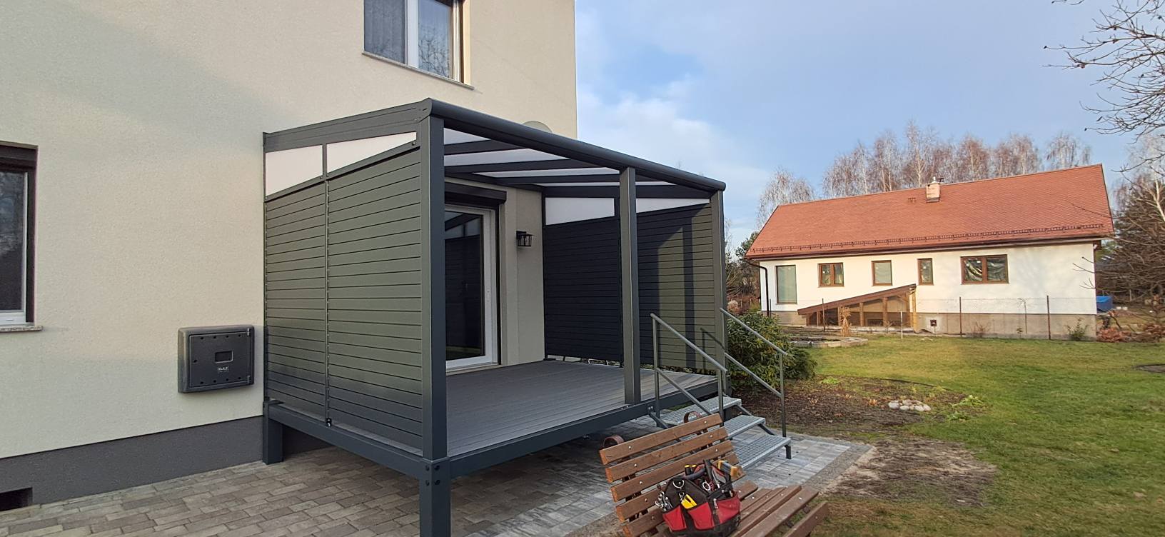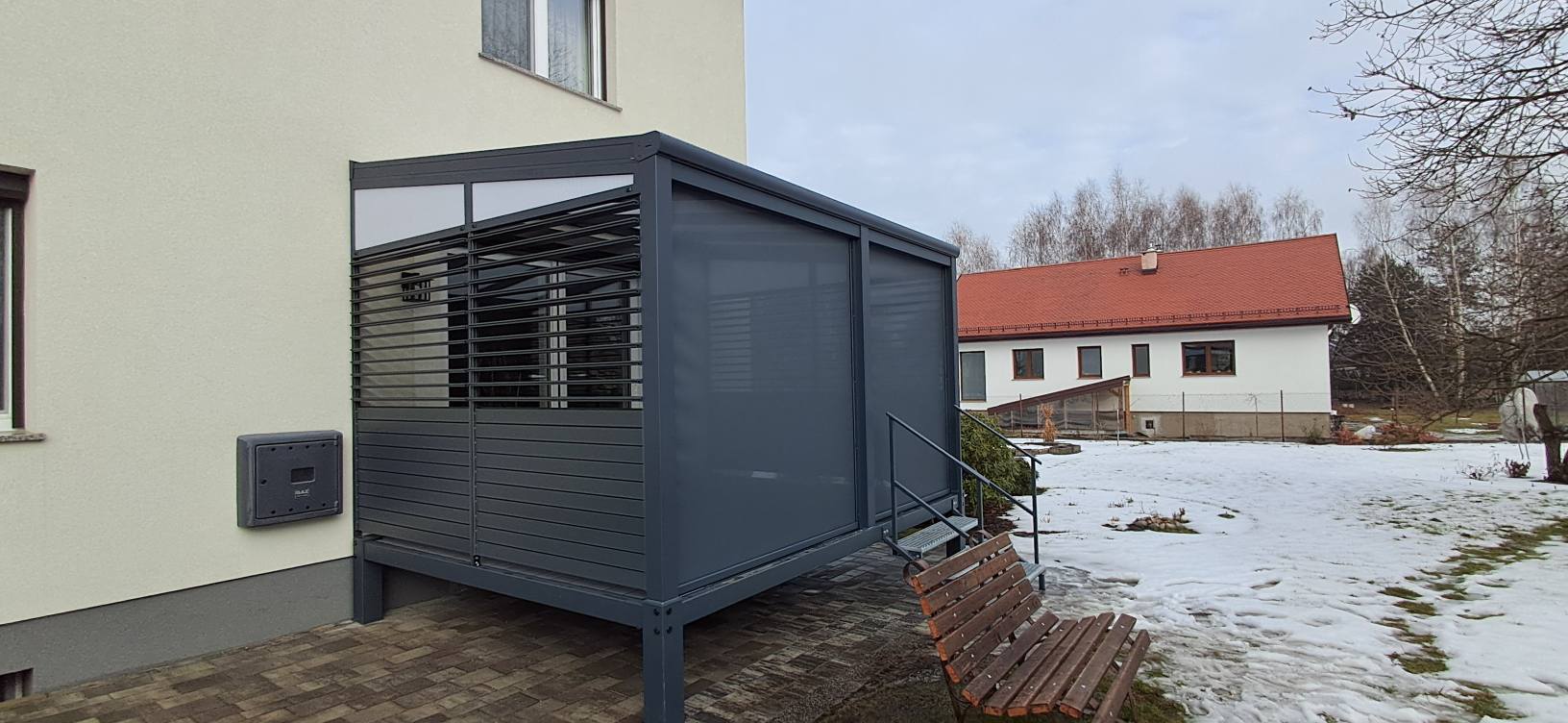 Montaż zadaszenia tarasu V905 o wymiarach 309cm x 397cm. Aluminiowa konstrukcja w kolorze VS716 – antracytowy strukturalny została pokryta poliwęglanem komorowym 16mm mlecznym. Po lewej i prawej stronie wykonana została zabudowa składająca się ze ściany szczytowej Serena wypełnionej poliwęglanem komorowym 16mm mlecznym oraz z ruchomych żaluzji aluminiowych w kolorze antracytowym. Zadaszenie podparte trzema słupami. Wysokość profilu szczytowego to 255cm, a wysokość profilu rynny to 220cm. Miejsce montażu – Lubliniec w województwie śląskim.