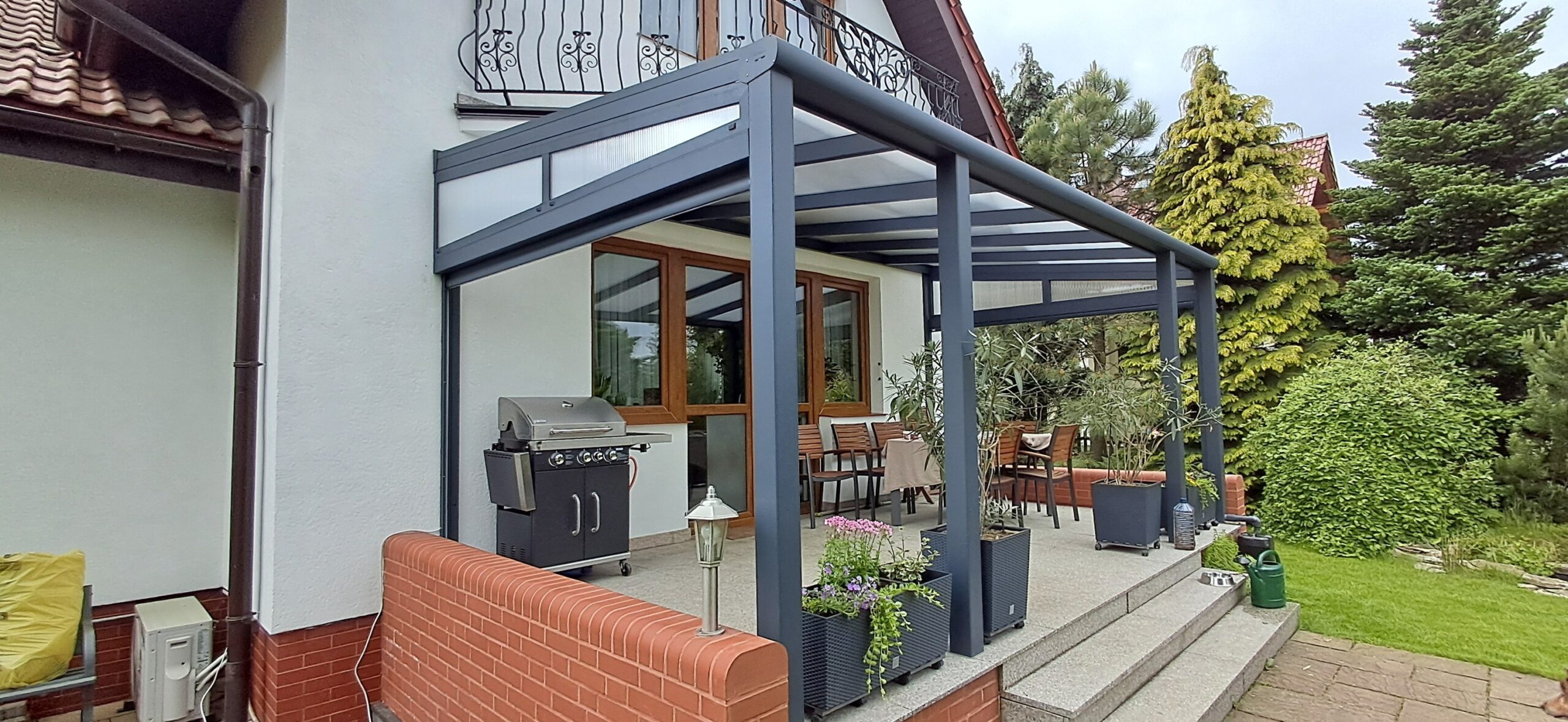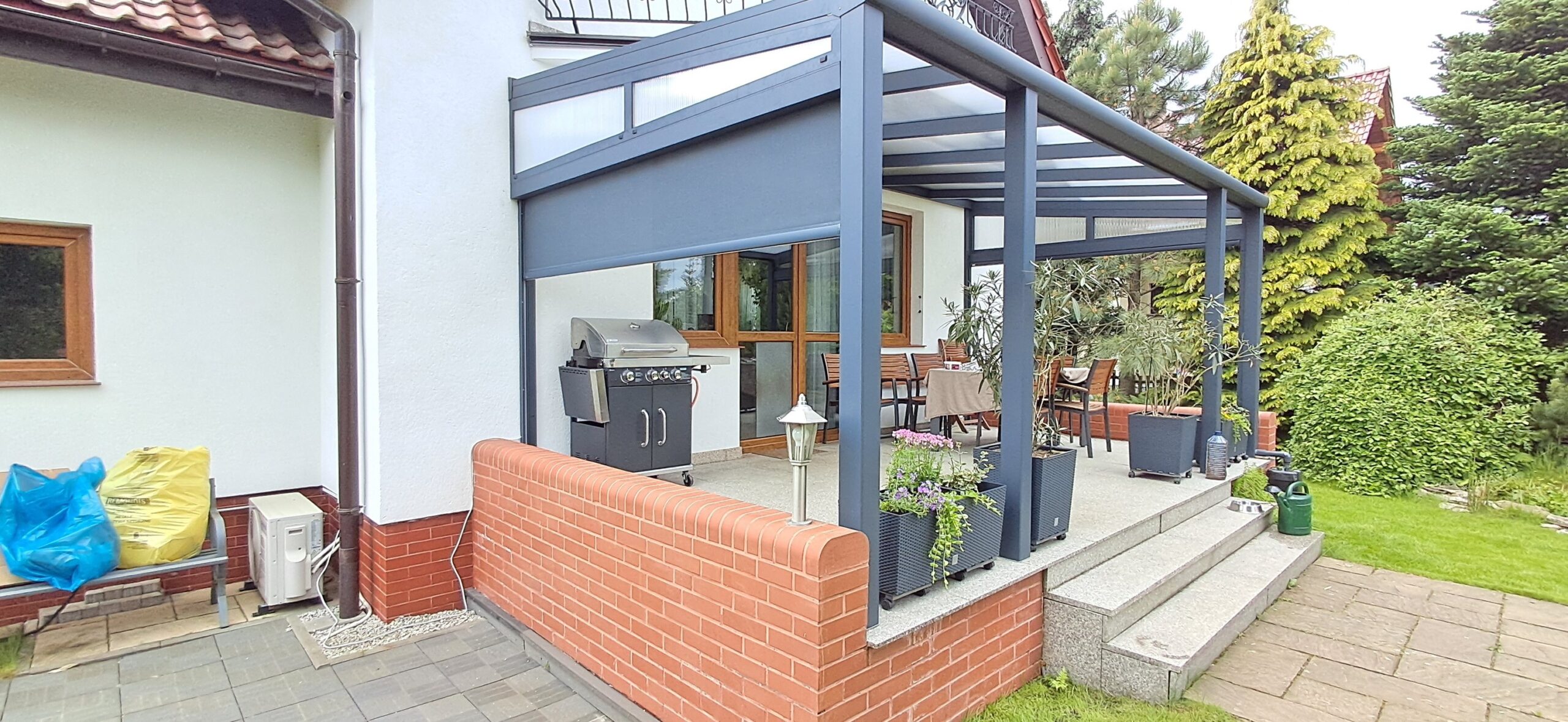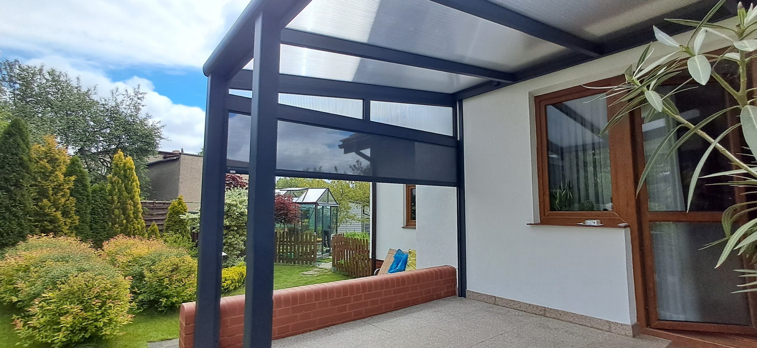 Tym razem do lewej strony zadaszenia V905 z zeszłego roku dołączyła ściana szczytowa Serena pokryta poliwęglanem komorowym 16mm bezbarwnym oraz markizą ściena V550 sterowana bezprzewodowo pilotem Somfy.